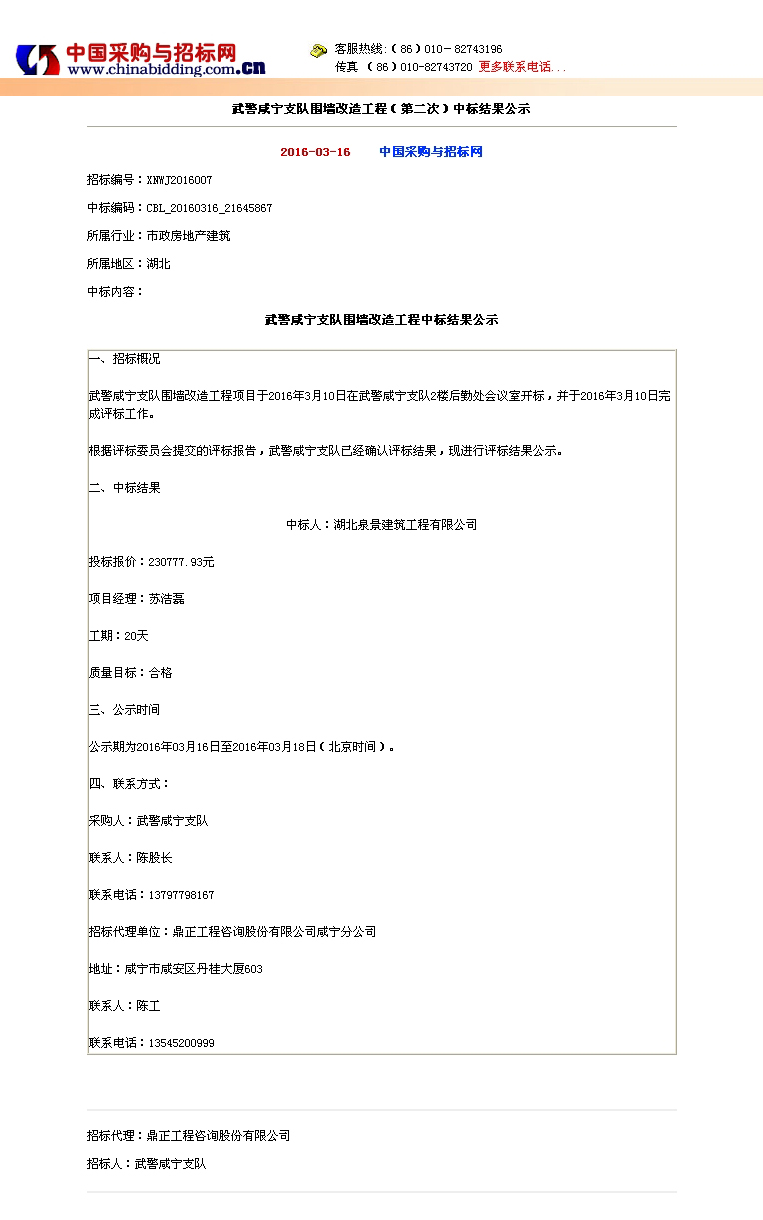 武警咸寧支隊圍墻改造工程(第二次)中標公示
