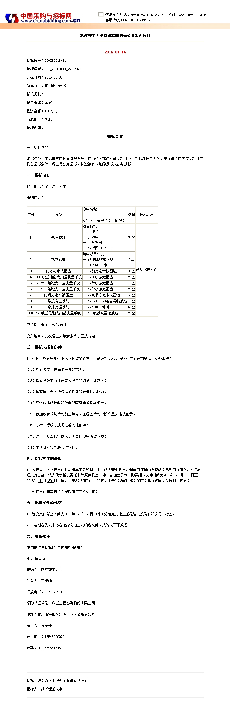武漢理工大學(xué)智能車輛感知設(shè)備采購項(xiàng)目招標(biāo)公告