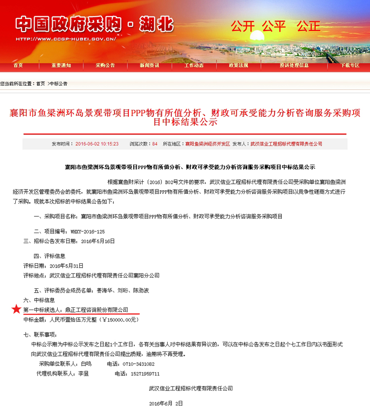 【經(jīng)營(yíng)成果】我司中標(biāo)襄陽(yáng)市魚(yú)梁洲環(huán)島景觀帶項(xiàng)目PPP物有所值分析、財(cái)政可承受能力分析咨詢服務(wù)?采購(gòu)項(xiàng)目