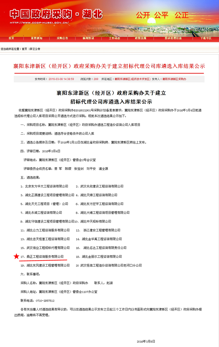 【經(jīng)營(yíng)成果】我司入圍襄陽(yáng)東津新區(qū)(經(jīng)開(kāi)區(qū))政府采購(gòu)辦招標(biāo)代理公司庫(kù)