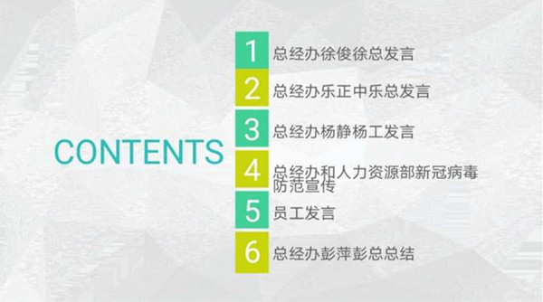 本次會(huì)議由人力資源部譚蓉主持,每位同事從自己的生活狀態(tài)到對(duì)工作的匯報(bào)和對(duì)戰(zhàn)勝疫情的決心中娓娓而談,閑話家談中表達(dá)出自己對(duì)未來生活的美好祝愿。