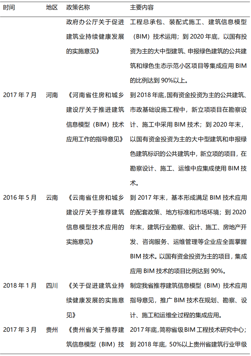 從2014年開(kāi)始,在住建部的大力推動(dòng)下,各省市政策相繼出臺(tái)BIM推廣應(yīng)用文件,到目前我國(guó)已初步形成BIM技術(shù)應(yīng)用標(biāo)準(zhǔn)和政策體系,為BIM的快速發(fā)展奠定了堅(jiān)實(shí)的基礎(chǔ)。2017年,貴州、江西、河南等省市正式出臺(tái)BIM推廣意見(jiàn),明確提出在省級(jí)范圍內(nèi)提出推廣BIM技術(shù)應(yīng)用。2018-2019年,各地政府對(duì)于BIM技術(shù)的重視程度不減,重慶、北京、吉林、深圳等多地政策出臺(tái)指導(dǎo)意見(jiàn),旨在推動(dòng)BIM技術(shù)進(jìn)一步應(yīng)用普及。隨著我國(guó)出臺(tái)BIM推廣意見(jiàn)的省市數(shù)量逐漸增多,全國(guó)BIM技術(shù)應(yīng)用推廣的范圍更加廣泛。表2列舉了部分重要地方鼓勵(lì)政策。