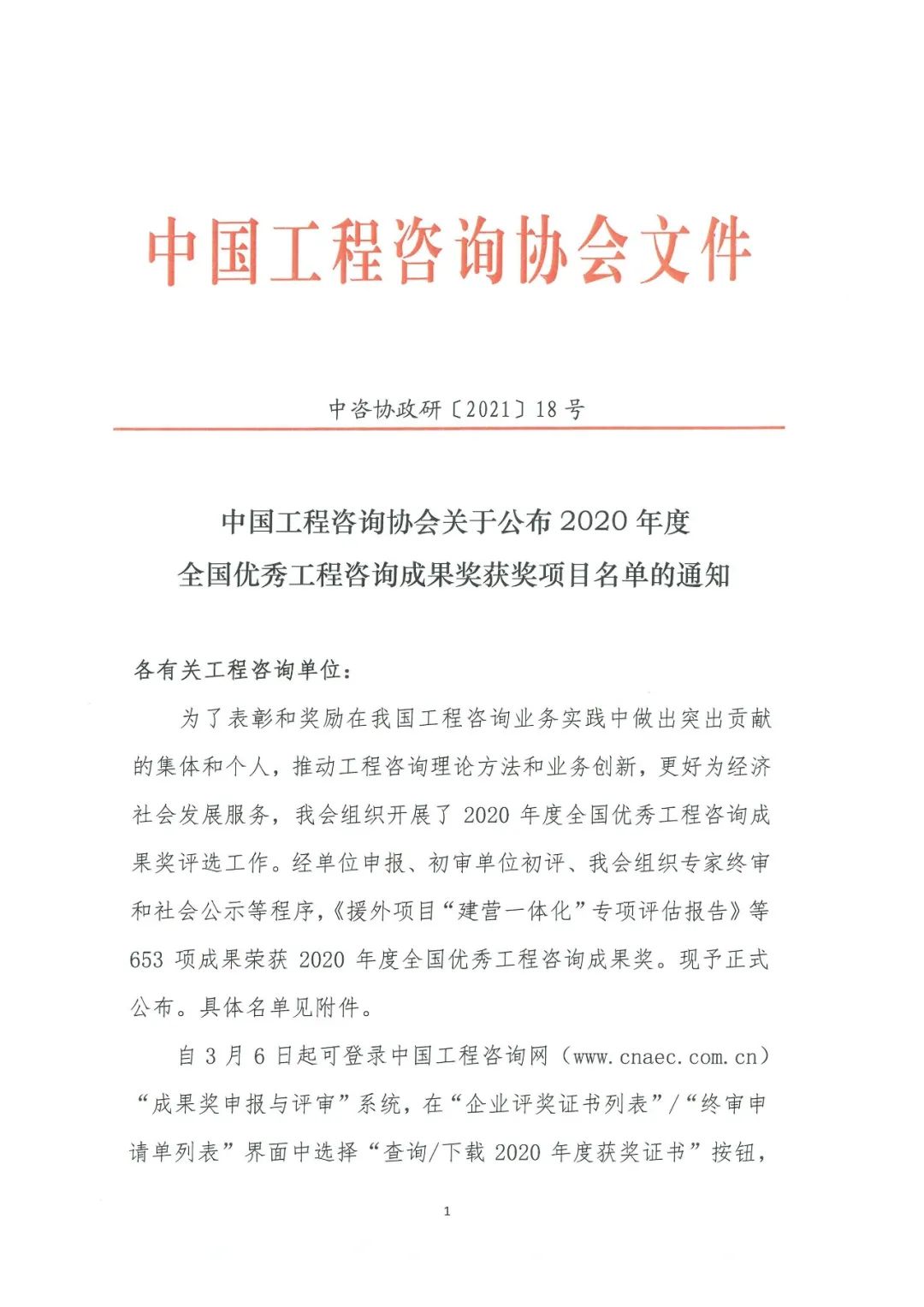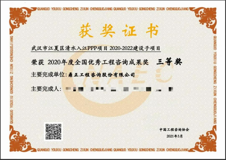 2021年3月5日,中國工程咨詢協(xié)會公布了“2020年度全國優(yōu)秀工程咨詢成果獎”獲獎項目名單,鼎正咨詢繼2019年全咨項目榮獲全國優(yōu)秀工程咨詢成果獎后,又一PPP咨詢項目——由鼎正咨詢獨立編制完成的“武漢市江夏區(qū)清水入江PPP項目 2020-2022建設子項目”實施方案再度榮獲全國優(yōu)秀工程咨詢成果三等獎!