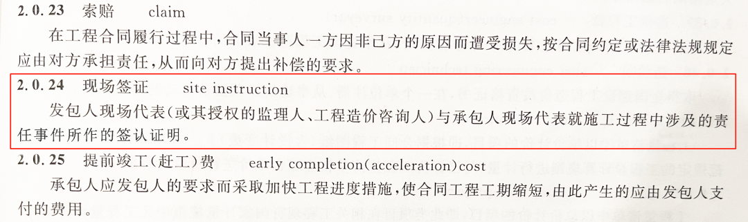 依據(jù)《建設(shè)工程工程量清單計(jì)價(jià)規(guī)范》(GB50500-2013)第2.0.24條對(duì)現(xiàn)場(chǎng)簽證的定義:“發(fā)包人現(xiàn)場(chǎng)代表與承包人現(xiàn)場(chǎng)代表就施工過程中涉及的責(zé)任事件所作的簽認(rèn)證明?!?/span>