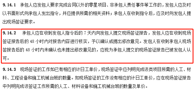 此外,第9.14.2條中,“......發(fā)包人在收到承包人現(xiàn)場(chǎng)簽報(bào)告后的48小時(shí)內(nèi)未確認(rèn)也未提出修改意見的,應(yīng)視為承包人提交的現(xiàn)場(chǎng)簽證報(bào)告已被發(fā)包人認(rèn)可?!?/span>即,從時(shí)限來講,“48小時(shí)”亦非能夠滿足發(fā)包方充分詢價(jià)并與承包方定價(jià)的時(shí)長。