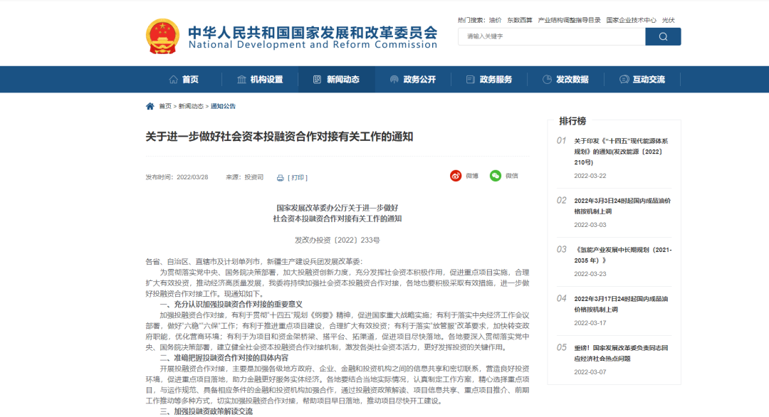 3月28日,國家發(fā)展改革委辦公廳印發(fā)《關(guān)于進(jìn)一步做好社會資本投融資合作對接有關(guān)工作的通知》(以下簡稱《通知》),部署各地積極采取有效措施,進(jìn)一步做好投融資合作對接工作。