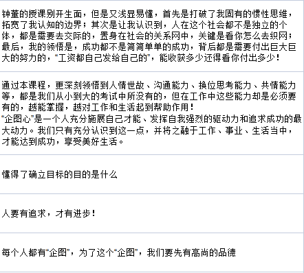 開堂的第一節(jié)課,他以《打開企圖心》為主題,以提問為主的方式,激發(fā)線上線下的學(xué)員深入思考:我們?yōu)楹味鴬^斗?我們因何而得到?既不是秀才(編者注:此語境下的含義為生活優(yōu)渥者)也不是落榜者(編者注:此語境下的含義為因失敗而發(fā)憤圖強者)的我們又當(dāng)以什么作為自身前進的動力?……