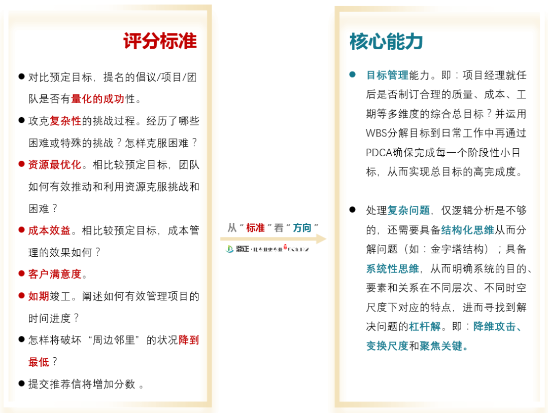 通過此次評獎申報過程中的思考與體會,我們想從RICS中國獎評分標(biāo)準(zhǔn)談?wù)勴椖拷?jīng)理的努力方向。無論是投資決策咨詢、規(guī)劃設(shè)計,還是政府采購與招標(biāo)代理、工程造價咨詢、工程監(jiān)理及項目管理咨詢的項目經(jīng)理,都需要明確?優(yōu)秀的項目管理是什么樣的?要實現(xiàn)這些成果需要培養(yǎng)并精進(jìn)哪些核心能力?