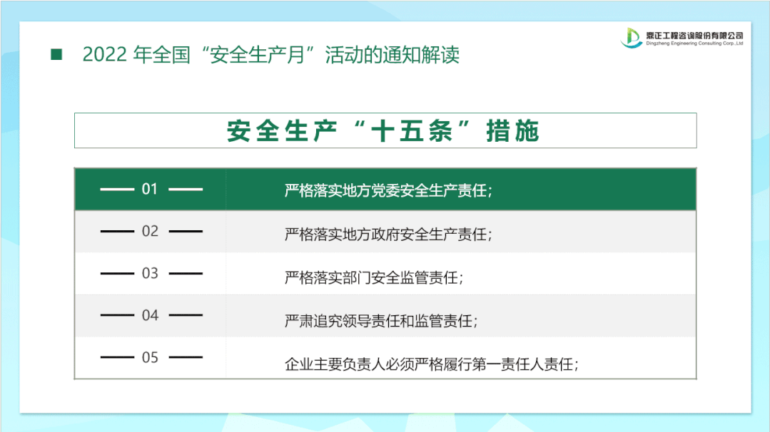 2022年全國“安全生產(chǎn)月”重點工作要求,1.深入學習貫徹習近平總書記關于安全生產(chǎn)重要論述,推動落實安全生產(chǎn)十五條措施;2.宣傳貫徹安全生產(chǎn)法,推動“第一責任人”守法履責;3.持續(xù)開展“安全生產(chǎn)萬里行”活動,分類強化警示教育;4.廣泛開展“安全宣傳咨詢?nèi)铡焙桶踩麄鳌拔暹M”活動,提升社會公眾安全意識和自救互救能力。