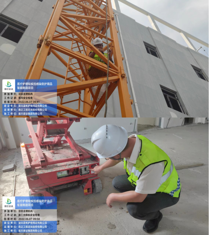 6月7日,醫(yī)療護理和疾控感染防護用品智能制造項目總監(jiān)理工程師陳雄對施工現(xiàn)場進行塔吊、物料提升機、施工升降機、吊籃、臨時用電進行聯(lián)合檢查,現(xiàn)場抽檢施工單位的安全生產(chǎn)規(guī)范。此次檢查以安全生產(chǎn)細化管理為要求,以查隱患、找短板、促整改、防事故為目的。安全是確保工程質量的前提條件,質量是建設單位所追求的最終目標,安全則是實現(xiàn)這一目標的基本環(huán)境條件,安全監(jiān)理是這一環(huán)境條件的保護神。