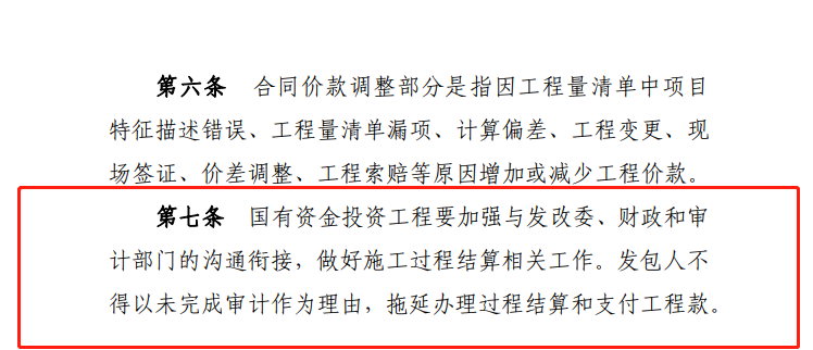 推行過程結(jié)算,建設(shè)單位應(yīng)滿足施工所需的資金安排,工程驗(yàn)收通過時(shí)原則上應(yīng)同步完成工程款結(jié)算,不得變相拖延結(jié)算。國(guó)有資金投資工程應(yīng)當(dāng)按照國(guó)家有關(guān)規(guī)定確保資金按時(shí)支付到位,不得以未完成審計(jì)作為延期工程款結(jié)算的理由。在以往的建設(shè)工程司法案例中,合同雙方若在合同中約定以行政審計(jì)后的價(jià)款作為結(jié)算價(jià)款的,法院予以支持。眾所周知,行政審計(jì)一般在項(xiàng)目驗(yàn)收完成之后進(jìn)行,那么在推行施工過程結(jié)算的背景下,發(fā)包人在招標(biāo)文件及合同條款中再約定以行政審計(jì)后的價(jià)款作為結(jié)算依據(jù)的,明顯與過程結(jié)算的推行意義相違背。
