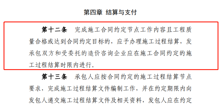 本條定義何為施工過程結(jié)算,相較住建部2021年發(fā)布的《建筑工程施工發(fā)包與承包計(jì)價(jià)管理辦法》(修訂征求意見稿)第十九條規(guī)定“全面推行施工過程結(jié)算和支付。發(fā)承包雙方通過合同約定,按時(shí)間節(jié)點(diǎn)或進(jìn)度節(jié)點(diǎn)對(duì)周期內(nèi)已完成且無爭(zhēng)議的工程量進(jìn)行價(jià)款計(jì)算、確認(rèn),并按照合同約定比例支付?!?span style=";margin: 0px; padding: 0px; outline: 0px; max-width: 100%;Helvetica Neue", "PingFang SC", "Hiragino Sans GB", "Microsoft YaHei UI", "Microsoft YaHei", Arial, sans-serif; text-align: justify; background-color: rgb(248, 248, 248); box-sizing: border-box !important; overflow-wrap: break-word !important;">《暫行辦法》增加了節(jié)點(diǎn)驗(yàn)收,驗(yàn)收是節(jié)點(diǎn)結(jié)算與支付的前提。