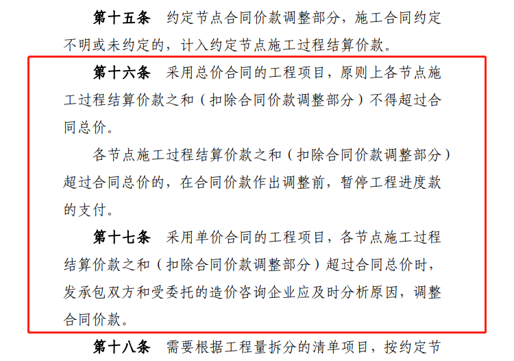 分別對(duì)總價(jià)合同的建設(shè)項(xiàng)目和單價(jià)合同的建設(shè)項(xiàng)目的施工過程結(jié)算的方式和過程進(jìn)行解釋、說明??偠灾?,不管總價(jià)合同還是單價(jià)合同,施工過程結(jié)算價(jià)款之和(扣除合同價(jià)款調(diào)整部分)均不得超過合同總價(jià),否則可能出現(xiàn)工程未完成已支付完成的情況。具體支付比例可根據(jù)發(fā)包人資金使用計(jì)劃在合同中約定,但不得低于當(dāng)?shù)匦姓鞴懿块T的相關(guān)規(guī)定。