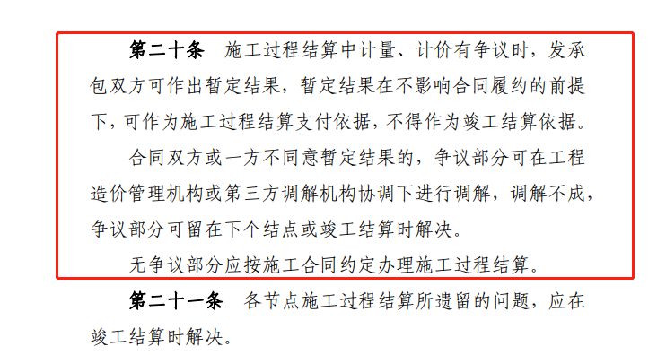 施工過程結(jié)算中計(jì)量、計(jì)價(jià)有爭(zhēng)議和無爭(zhēng)議兩種情形。對(duì)于有爭(zhēng)議部分,發(fā)承包雙方可作出暫定結(jié)果,并作為施工過程結(jié)算支付依據(jù),但不得作為竣工結(jié)算依據(jù),最終竣工結(jié)算按照雙方在調(diào)解后確定,或者在下個(gè)結(jié)點(diǎn)或者竣工結(jié)算時(shí)確定。