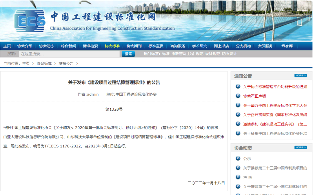 鼎正參編的《建設項目過程結算管理標準》(T/CECS 1178-2022)正式發(fā)布