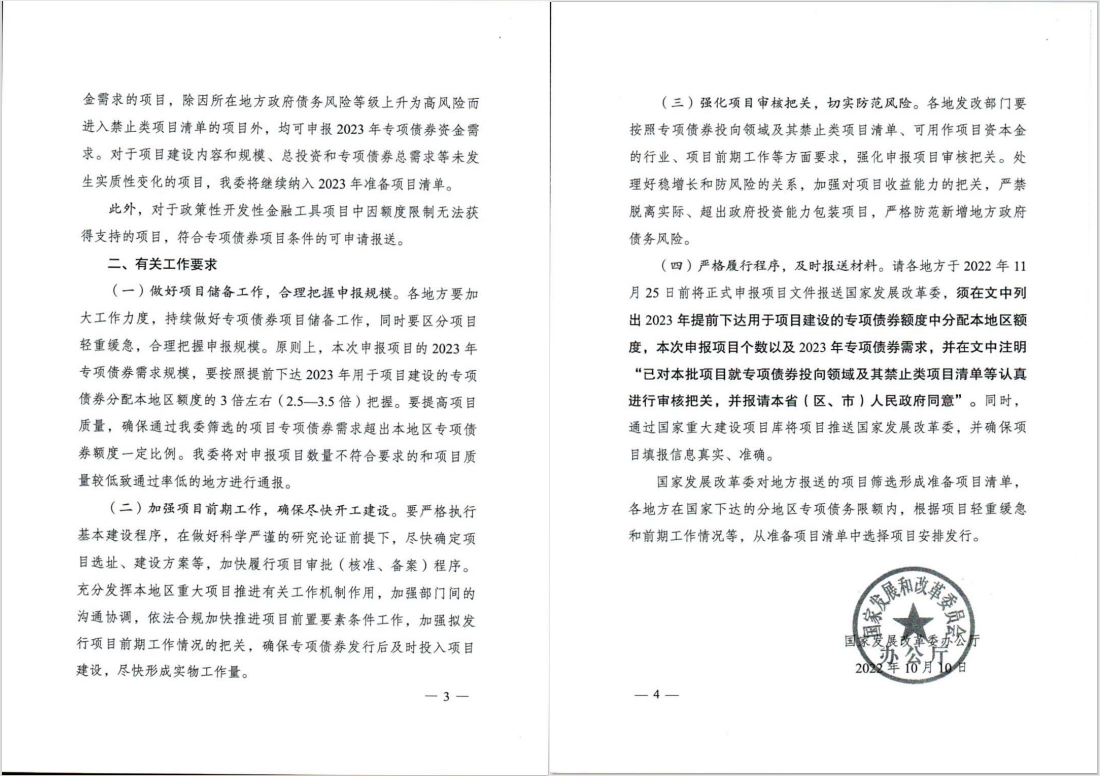 (4)項(xiàng)目申報(bào)的總額度,按照提前下達(dá)2023年用于項(xiàng)目建設(shè)的專項(xiàng)債分配本地區(qū)額度的3倍左右(2.5—3.5)把握。