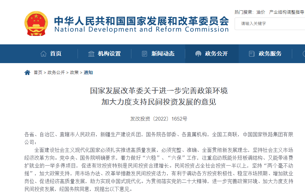 全面建設(shè)社會(huì)主義現(xiàn)代化國家必須扎實(shí)推進(jìn)高質(zhì)量發(fā)展,必須完整、準(zhǔn)確、全面貫徹新發(fā)展理念,堅(jiān)持社會(huì)主義市場經(jīng)濟(jì)改革方向。黨中央、國務(wù)院明確要求,著力做好“六穩(wěn)”、“六?!惫ぷ?,注重啟動(dòng)既能補(bǔ)短板調(diào)結(jié)構(gòu)、又能帶消費(fèi)擴(kuò)就業(yè)的一舉多得項(xiàng)目,促進(jìn)有效投資特別是民間投資合理增長。民間投資占全社會(huì)投資一半以上,堅(jiān)持“兩個(gè)毫不動(dòng)搖”,加大政策支持,用市場辦法、改革舉措激發(fā)民間投資活力,有利于調(diào)動(dòng)各方投資積極性、穩(wěn)定市場預(yù)期、增加就業(yè)崗位、促進(jìn)經(jīng)濟(jì)高質(zhì)量發(fā)展,助力實(shí)現(xiàn)中國式現(xiàn)代化。為貫徹落實(shí)黨的二十大精神,進(jìn)一步完善政策環(huán)境、加大力度支持民間投資發(fā)展,經(jīng)國務(wù)院同意,現(xiàn)提出以下意見。