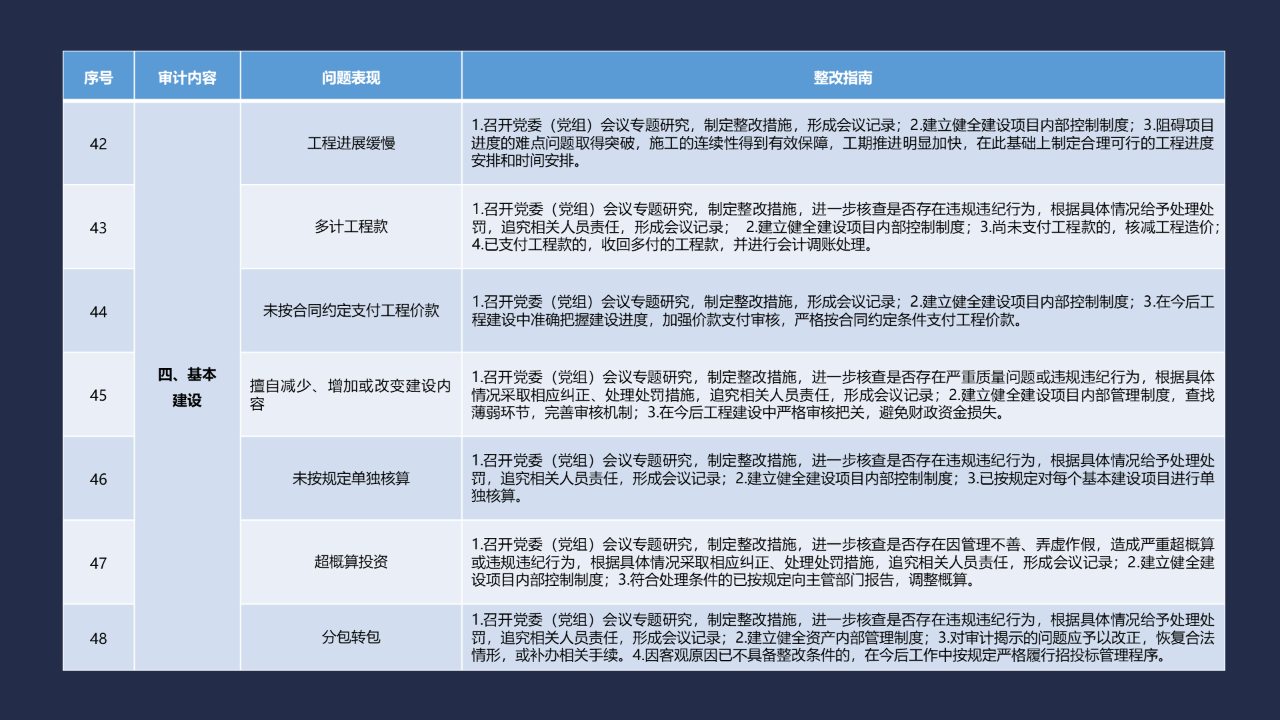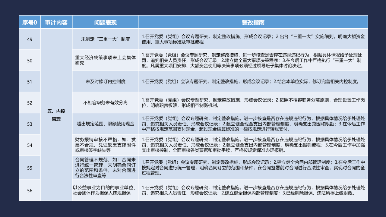 《整改指南100條》是在《江西省審計(jì)廳審計(jì)整改督查工作暫行辦法》(贛審綜發(fā)〔2021〕4號)第四章“審計(jì)整改認(rèn)定標(biāo)準(zhǔn)”有關(guān)規(guī)定的基礎(chǔ)上,結(jié)合審計(jì)整改工作實(shí)際,對常見審計(jì)查出問題的整改結(jié)果認(rèn)定標(biāo)準(zhǔn)進(jìn)行明確和細(xì)化。《整改指南100條》按照常見的重大政策措施落實(shí)、預(yù)算管理、政府采購及招投標(biāo)、基本建設(shè)、內(nèi)控管理、企業(yè)管理、自然資源、社保資金及安居工程、金融管理、國外貸援款共10類審計(jì)內(nèi)容進(jìn)行問題分類,列舉了100個(gè)常見問題并給出相對應(yīng)的整改標(biāo)準(zhǔn)說明,重點(diǎn)突出落實(shí)被審計(jì)單位整改主體責(zé)任、建立健全規(guī)章制度、推動問題全面整改等方面的內(nèi)容,審計(jì)機(jī)關(guān)和整改責(zé)任單位可以在審計(jì)整改工作中參照落實(shí)。