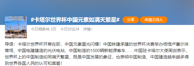 11月20日,2022年卡塔爾世界杯正式開(kāi)幕。開(kāi)幕式當(dāng)天,中國(guó)外交部發(fā)言人華春瑩在推特上連發(fā)8條推文,以圖文并茂的方式介紹世界杯“隨處可見(jiàn)的中國(guó)元素”。這也讓“卡塔爾世界杯中國(guó)元素如滿天繁星”的話題登上熱搜。