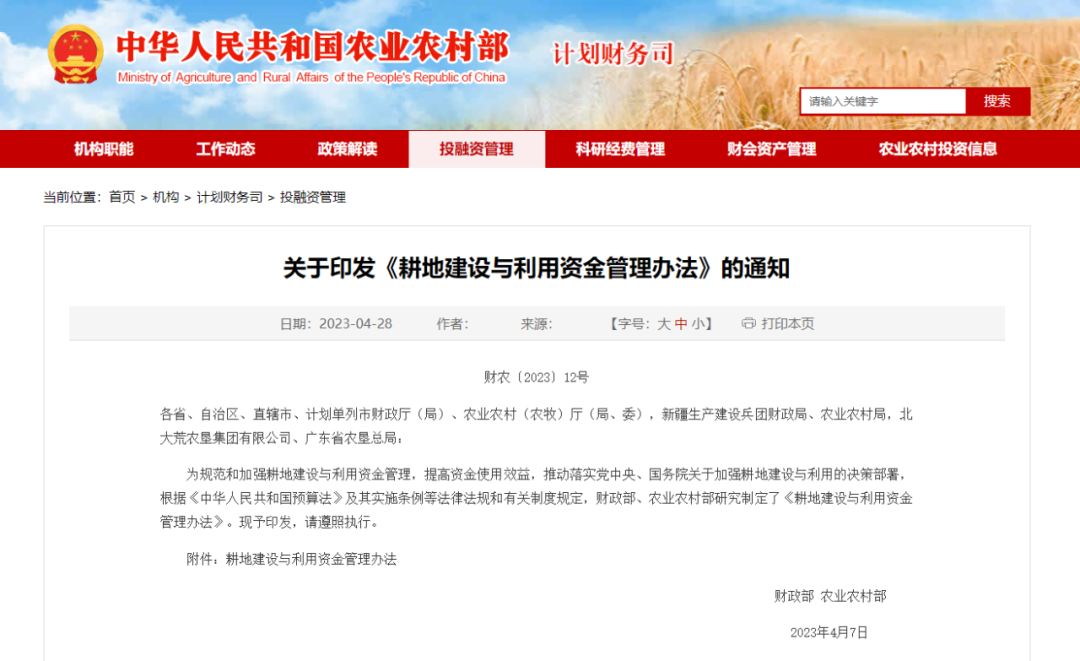 財(cái)政部、農(nóng)業(yè)農(nóng)村部印發(fā)《耕地建設(shè)與利用資金管理辦法》