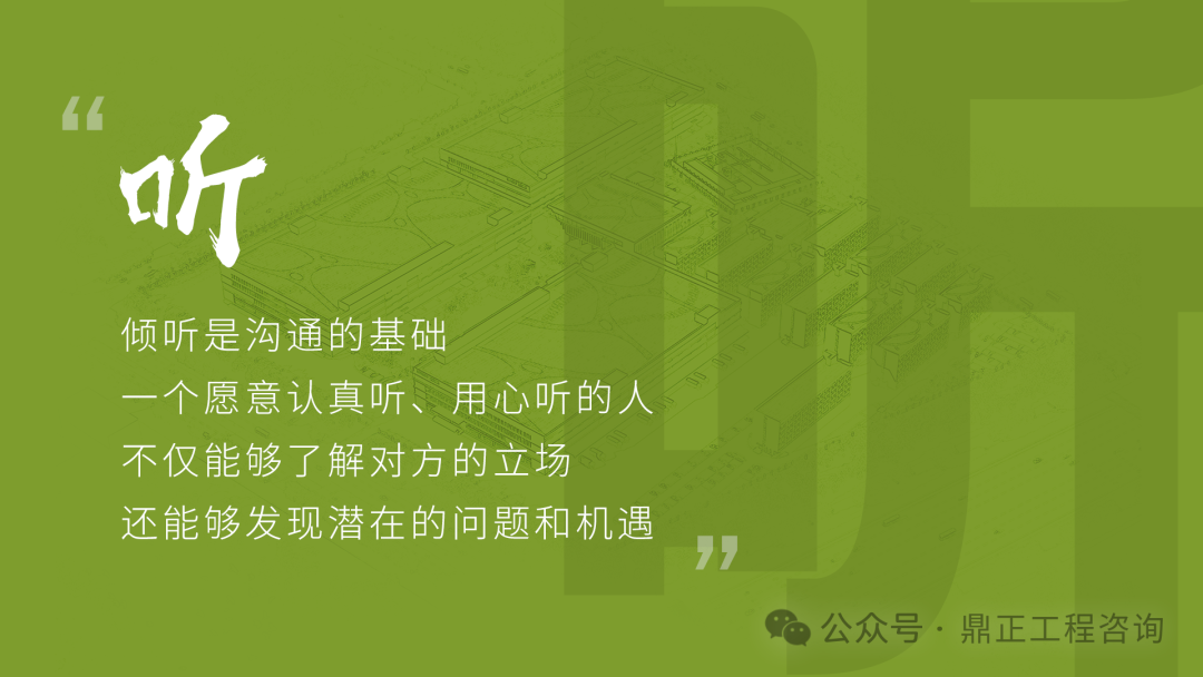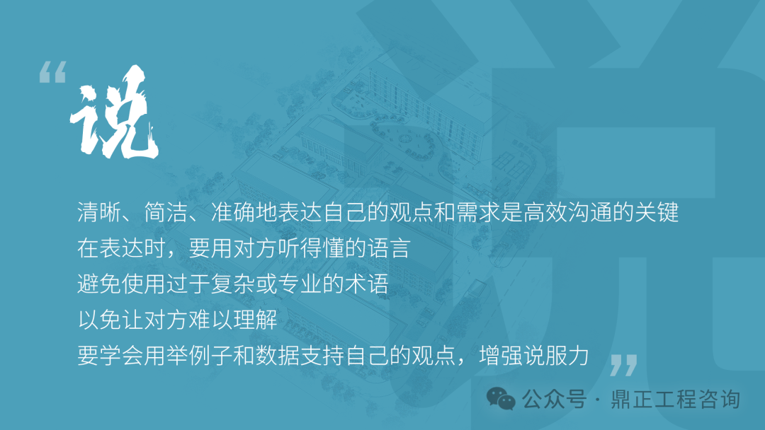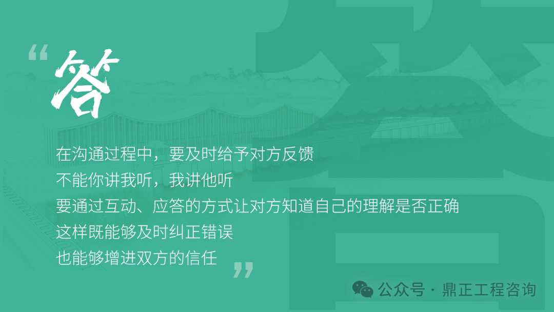 交流要看對(duì)象,不能對(duì)牛彈琴。與農(nóng)民工交流要用農(nóng)民工聽得懂的語(yǔ)言;與同行或其他咨詢機(jī)構(gòu)交流要用專業(yè)語(yǔ)言;與直接上級(jí)交流要及時(shí)反饋并提出合理建議;與客戶交流,要從客戶的視角出發(fā),為其提供最優(yōu)解決方案。