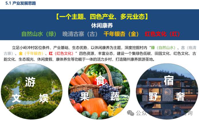 其中,雙河村通過發(fā)揮特色農(nóng)業(yè)產(chǎn)業(yè)優(yōu)勢(shì)建設(shè)農(nóng)業(yè)品牌,延伸農(nóng)業(yè)加工產(chǎn)業(yè)鏈開啟創(chuàng)收新征程,積極發(fā)展鄉(xiāng)村休閑業(yè)打造詩意田園水鄉(xiāng),主要打造田園綜合體、濱河休閑體驗(yàn),拓展農(nóng)業(yè)休閑旅游業(yè)態(tài)。泉水寺村重點(diǎn)結(jié)合國家級(jí)專用汽車和應(yīng)急裝備檢測(cè)研發(fā)基地的建設(shè)基礎(chǔ),構(gòu)建以產(chǎn)業(yè)基地配套服務(wù)為主導(dǎo),以生態(tài)種養(yǎng)、休閑農(nóng)業(yè)為特色的產(chǎn)業(yè)體系。小嶺沖村重點(diǎn)整合“綠(自然山水)、古(晚清古寨)、金(千年銀杏)、紅(紅色文化)”四色資源,構(gòu)建“綠+古+金+紅”四色產(chǎn)業(yè),打造品質(zhì)活力鄉(xiāng)村旅游。九口堰村重點(diǎn)以豐富的紅色文化、自然資源為基礎(chǔ),以紅色文化體驗(yàn)為主導(dǎo)產(chǎn)業(yè),以文化帶動(dòng)旅游,拓展紅色體驗(yàn)、康養(yǎng)度假等產(chǎn)業(yè),打造全國紅色教育示范基地。