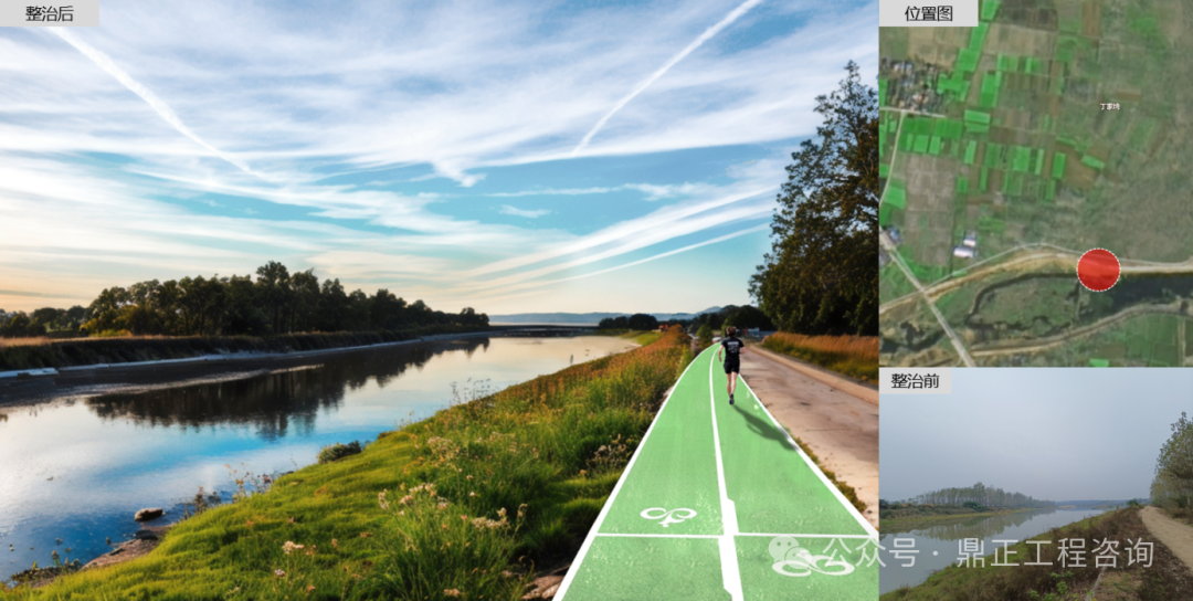 對(duì)雙河村漂水河駁岸進(jìn)行整治,對(duì)水系進(jìn)行清淤(恢復(fù)河床)、清障(疏通河道)、清理垃圾(清潔河道)、保持河道流暢干凈。對(duì)現(xiàn)狀岸邊植物雜灌木清除梳理,局部可增補(bǔ)色葉植物,豐富季相變化。增加濱水休閑步道,打造濱水開放空間。