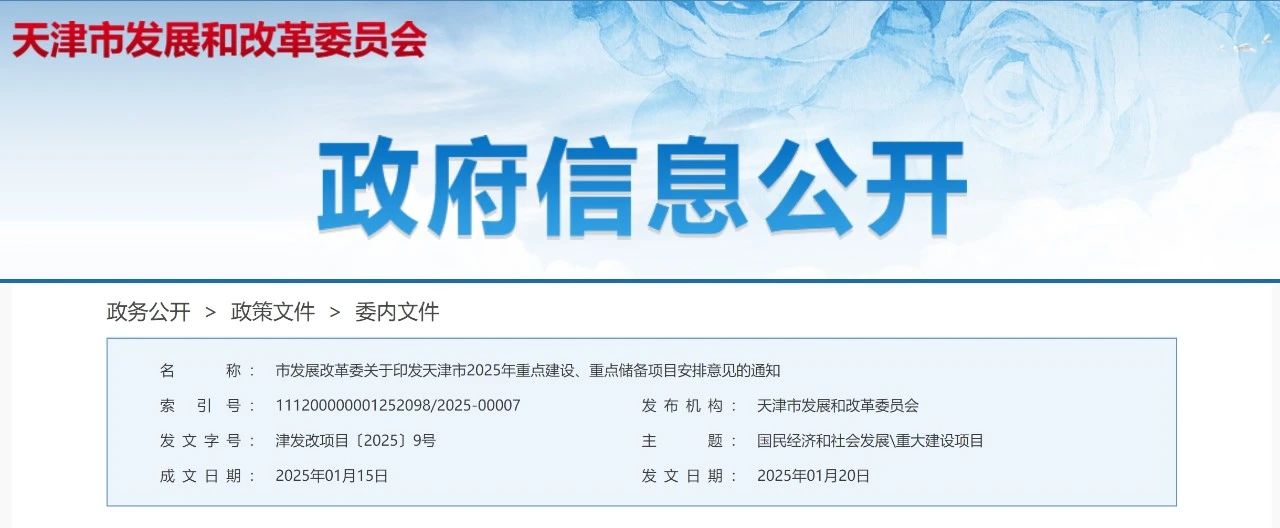 天津市發(fā)展改革委發(fā)布2025年重點(diǎn)建設(shè)、重點(diǎn)儲(chǔ)備項(xiàng)目安排意見(jiàn),共計(jì)1129個(gè)項(xiàng)目、總投資2.02萬(wàn)億元。其中,包括重點(diǎn)建設(shè)項(xiàng)目854個(gè),總投資1.52萬(wàn)億元,年度計(jì)劃投資2209.07億元,均為在建續(xù)建或即將開(kāi)工項(xiàng)目;重點(diǎn)儲(chǔ)備項(xiàng)目275個(gè),總投資4992.26億元。