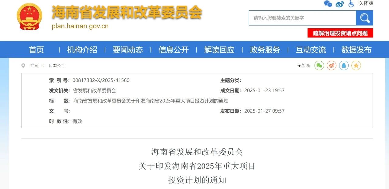 海南省發(fā)展改革委公布《海南省2025年重大項(xiàng)目投資計(jì)劃》。2025年安排省重大正式項(xiàng)目554個(gè),總投資8540億元,年度計(jì)劃投資1647億元。其中,竣工項(xiàng)目121個(gè)、續(xù)建項(xiàng)目274個(gè)、新開(kāi)工項(xiàng)目159個(gè)。此外,安排省級(jí)145個(gè)預(yù)備項(xiàng)目,總投資2485億元。