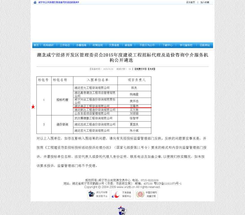 【經營成果】我司入圍湖北咸寧經濟開發(fā)區(qū)管理委員會2015年度建設工程招標代理及造價咨詢中介服務機構庫招標代理單位