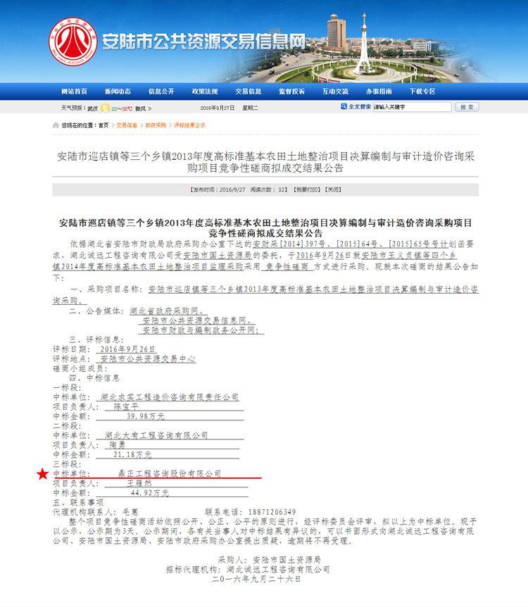 【經(jīng)營(yíng)成果】我司中標(biāo)安陸市巡店鎮(zhèn)等三個(gè)鄉(xiāng)鎮(zhèn)2013年度高標(biāo)準(zhǔn)基本農(nóng)田土地整治項(xiàng)目決算編制與審計(jì)造價(jià)咨詢(xún)采購(gòu)項(xiàng)目