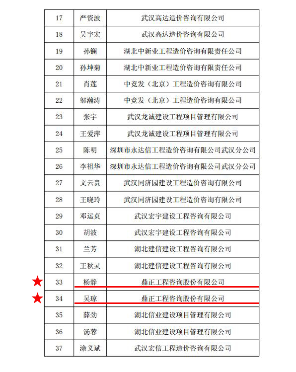 根據(jù)武建價(jià)協(xié)【2016】77號(hào)文件公示,我司員工楊靜、吳瓊榮獲2015-2016年度武漢市"優(yōu)秀造價(jià)工程師"稱號(hào),黃建新、張恒、吳輝、彭萍榮獲2015-2016年度“優(yōu)秀造價(jià)專業(yè)人員”稱號(hào)。此次榮譽(yù)的獲得,既是對(duì)我司同志工作的肯定,也展示了鼎正人愛崗敬業(yè)、爭(zhēng)創(chuàng)一流的精神風(fēng)貌。鼎正公司將以更加昂揚(yáng)的斗志和飽滿的熱情,服務(wù)于企業(yè)、服務(wù)于社會(huì)!
