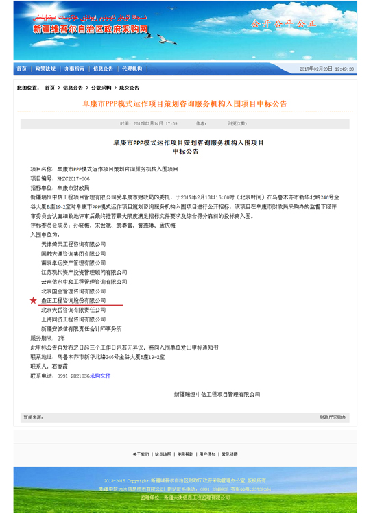 近日,新疆維吾爾自治區(qū)采購網(wǎng)公布了阜康市PPP模式運作項目策劃咨詢服務(wù)機構(gòu)入圍項目中標公告,我司成功入圍。