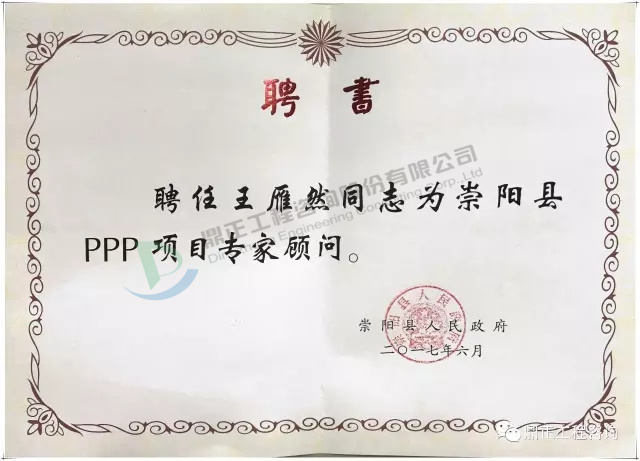 會中,崇陽縣人民政府為王雁然先生頒發(fā)崇陽縣PPP項目專家顧問聘書,負(fù)責(zé)指導(dǎo)崇陽縣PPP工作。