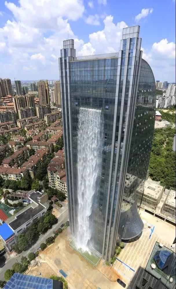 遠(yuǎn)遠(yuǎn)望去,噴水的大廈像是懸掛一片白練,足足有100多米高,走進(jìn)一看,原來是真的瀑布。