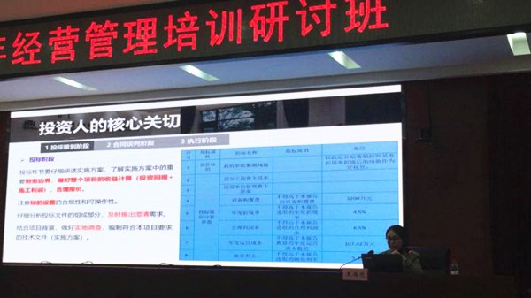 王雁然董事長從“PPP的發(fā)展趨勢”、“PPP概述”、“PPP政策”和“PPP全生命周期實(shí)務(wù)操作”四個(gè)方面進(jìn)行了全面系統(tǒng)的講解,PPP高級項(xiàng)目經(jīng)理王海蓮結(jié)合《京山市武荊高速公路連接線七寶山部分礦山地質(zhì)環(huán)境恢復(fù)治理工程PPP項(xiàng)目》(以下簡稱“七寶山PPP項(xiàng)目”)案例分享了投資人的核心關(guān)切與解決方案。七寶山PPP項(xiàng)目是地礦系統(tǒng)參與的第一個(gè)PPP項(xiàng)目,也是湖北省首個(gè)礦山地質(zhì)環(huán)境恢復(fù)治理工程采用PPP模式實(shí)施的項(xiàng)目。王海蓮經(jīng)理分析了該項(xiàng)目從策劃到落地全過程的核心關(guān)切點(diǎn),并對項(xiàng)目在執(zhí)行過程中可能會出現(xiàn)的風(fēng)險(xiǎn)點(diǎn)給出相應(yīng)建議方案。