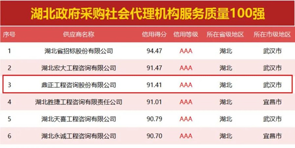 鼎正印記丨名列三甲 榮登湖北政府采購社會(huì)代理機(jī)構(gòu)服務(wù)質(zhì)量百強(qiáng)榜
